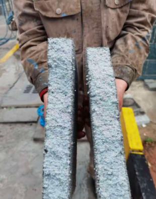 為了幫助記者理解,趙振波解釋說,“這些氣泡孔壁平均厚度45微米。”通過投影儀投射,顯微鏡下可以清晰地看到數以億計的泡孔,密密麻麻,猶如“銅墻鐵壁”一樣。 生產線上一臺嶄新的氮氣機吸引了記者的注意。“這可是我們最重要的‘法寶’之一。”趙振波說,當時,生產線建成之后,他們滿心歡喜地實驗時,卻發現水泥經過加水球磨后,產生“水化熱”,坯體中心溫度會高達80攝氏度以上,有時候甚至達到93攝氏度。“溫度過高,成型的時候就會膨脹,坯體就會開裂。這個問題不解決,意味著前期的一切研究成果都是徒勞的。” 包括鄭州大學土木學院建筑材料專家、教授鄭娟榮,鄭州大學綜合設計研究院有限公司副總工程師、教授級高級工程師栗海玉在內的研發團隊一時間陷入迷茫之中。多方查閱資料論證后,他們最后借鑒了“液氮運用到混凝土降溫”的啟發,意識到氮氣是惰性氣體,如果把工作環境中的空氣換成氮氣,或許能解決水化熱的問題,于是他們經過反復試驗,終于取得成功。 浸泡之后的無機塑化微孔保溫板